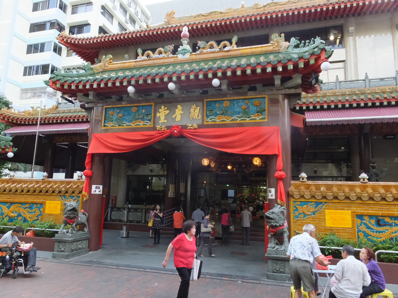 MRTブギス駅からブギス・ストリートを通り抜けて5分位のところにあります。小さな寺院ですが、お祈りをする人が建物前にいっぱいいて賑やかです。お線香やお供えの花を売る人たちもいます。隣にはヒンズー教の寺院があり、同じように祈る人で賑わっているのが興味深いです。
