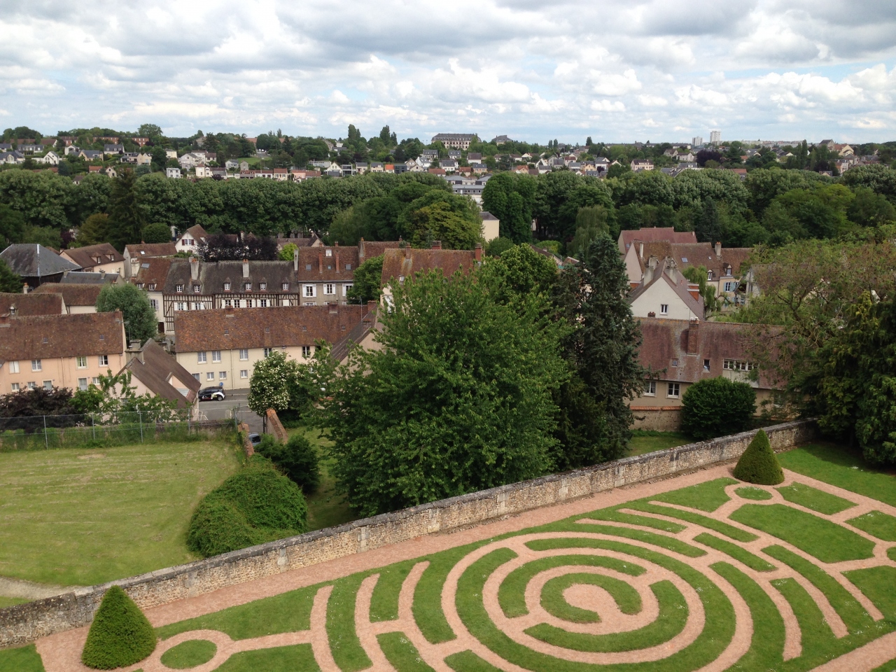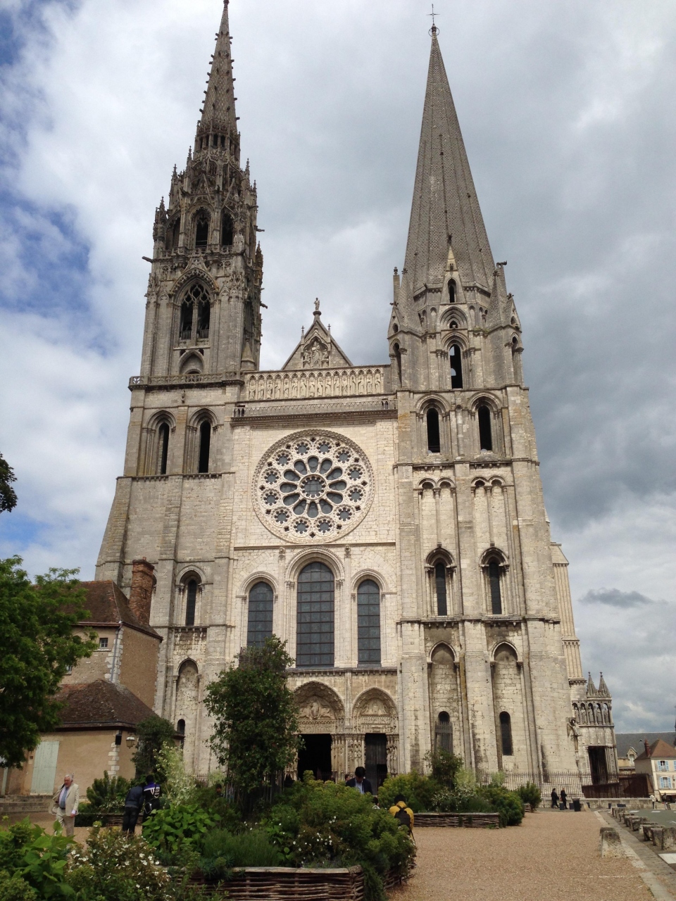 ちょうどキリスト昇天祭の日に行ったため、多くの人が訪れていました。教会西側の扉は大きく開け放たれていて、入って振り向けば西扉のバラ窓、中央右側には南扉のバラ窓、その近くにシャルトルブルーと呼ばれる「美しきガラス窓の聖母」が!一日中いて、東側から西側へと移る日差しの中でステンドグラスを見ていたいものです。教会の裏側からはシャルトルのパノラマが見られます。