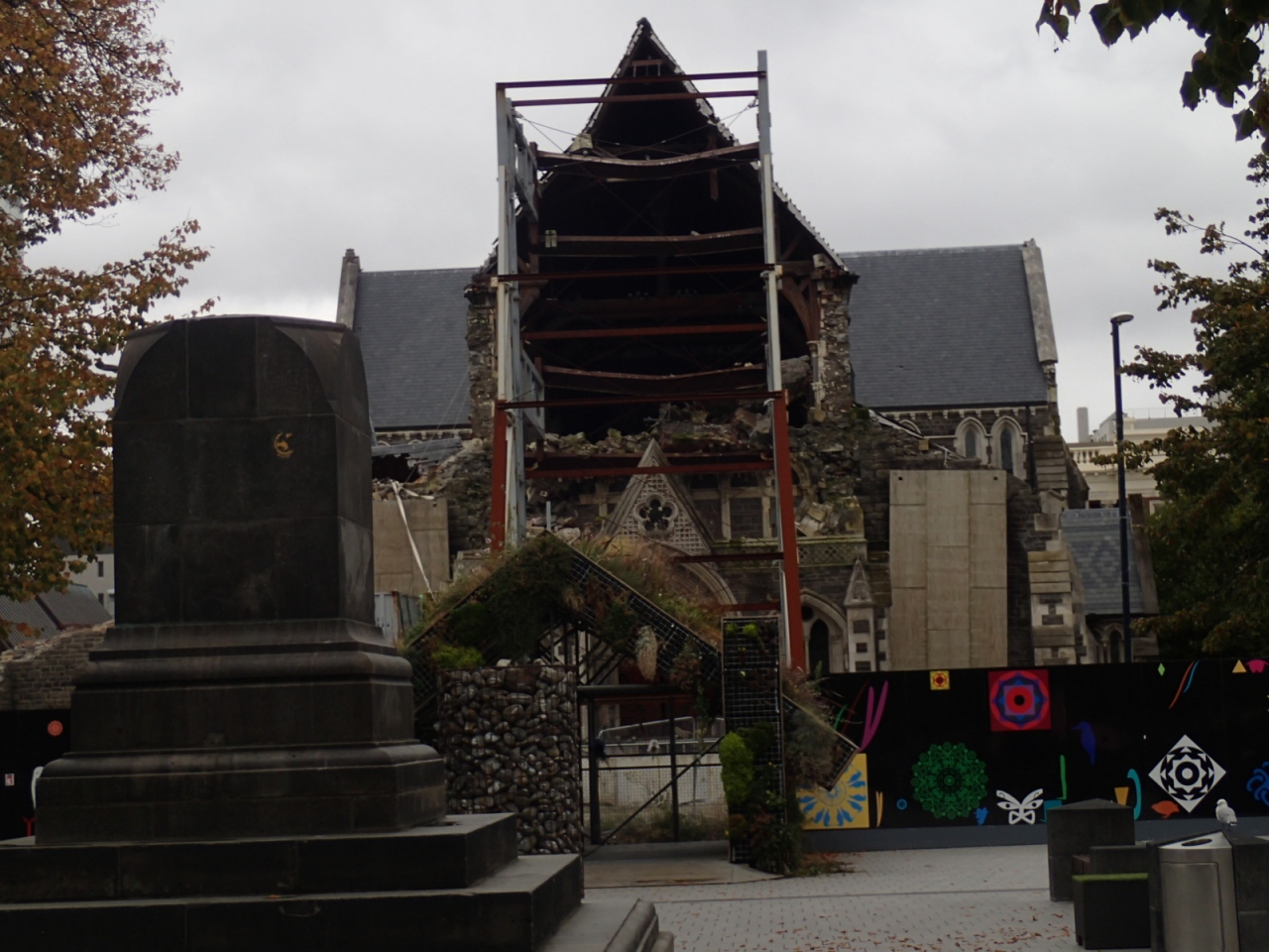 震災の傷跡が未だに露呈したカテドラルを見ていると悲しくなりますが、いつの日にか復旧されることを願うばかりです。周辺のビルは未だに閉鎖された物も有りますが、すでに復旧した路面電車が脇を通りぬける様子が昔の観光地の面影を感じさせます。