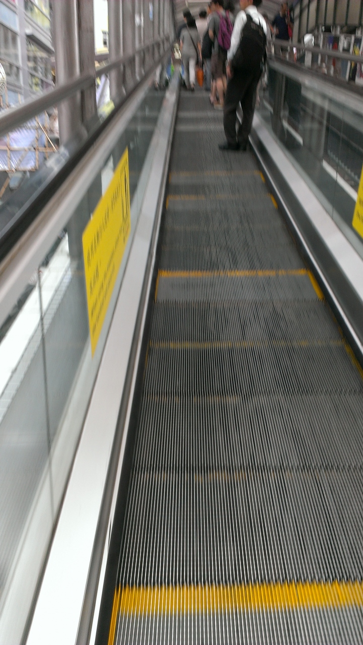 エスカレーターは階段状ではなく、動く歩道のような平らな状態で傾斜している部分もあり、左側が歩行者用に空ける習慣ではありますが、雨の日は非常に滑りやすく歩くのは危険な感じです。特に午前6~10時の下りの時間帯は歩けないでしょう。