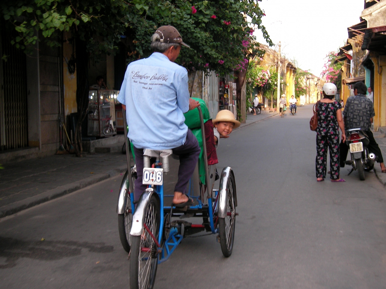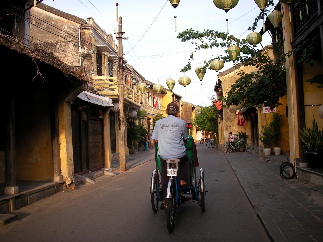 ホイアンの散策は朝に限る。朝6時前、まだ日が昇る前、外がようやく見えてきたころに宿を出て旧市街を散策。涼しいが歩くと少し汗ばむ。ここで、リキシャをつかまえて30分ほど人が誰もいない旧市街を走ってもらうとたいへん清々しく気持ちよい。朝早いのでリキシャが少ないが何とかつかまえて値段交渉。あちこちをリキシャでのんびり走ってもらうとのんびり感でいっぱいです。夜のひとごみ、昼の焼けるような暑さとは一味違うまたり感が味わえます。ホイアンには6泊しましたが、ほぼ毎日朝リキシャに乗ってました。おすすめです。