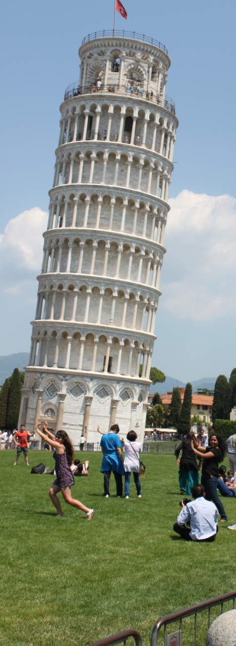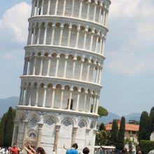 多くの観光客が斜塔に向けて、両手を突き出し、倒れるのを防ぐポーズで記念撮影。