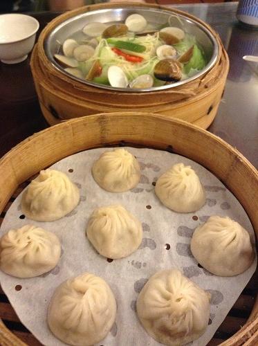小皿料理やれんげ、生姜などは自分で取りに行く形式。1人客から家族連れまで地元の人が食べに来ている食堂という雰囲気。小籠包もおいしいですが、ハマグリ料理など他のものもおいしかったです。気軽に試せていろんなものが食べられます。