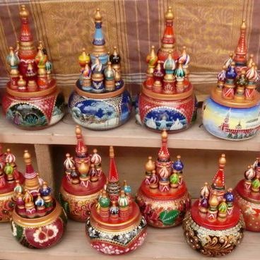 マトリョーシカ、グジェリ焼、ジョストヴォ、ベレスタ、ホフロマ塗り、たまねぎ型ドームのオルゴールなど色々あります。見ているだけでワクワクし、とても迷うでしょう。
