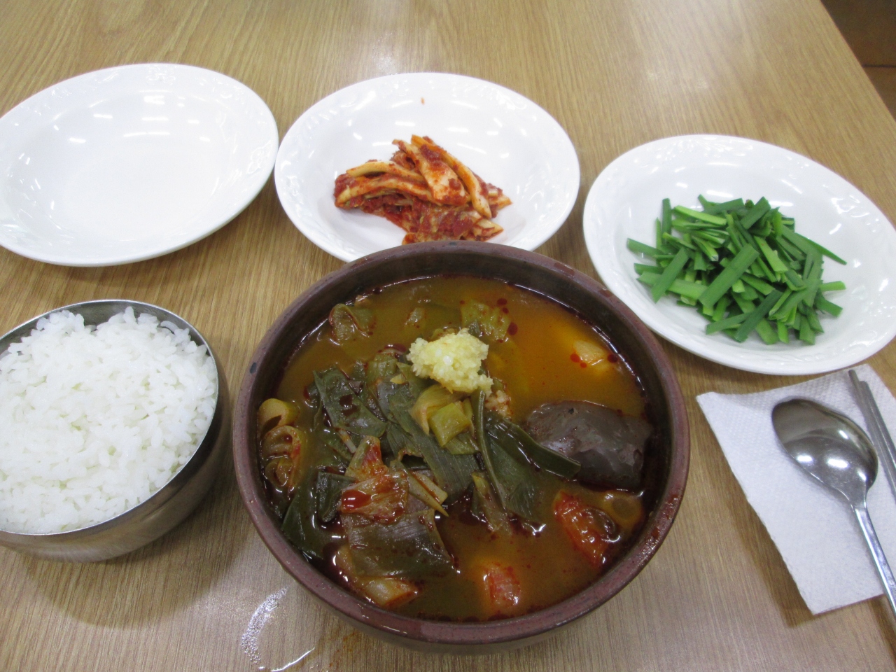 ソンジという牛の血の塊が入っているタロクッパ(6000won)を食べました。見た目は、血の塊に目を引くかもしれませんが、美味しい辛さです。