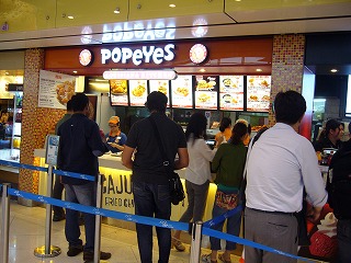 出国審査を終えた後にあるフードコート内の店舗です。チキンを看板メニューとするファーストフード店で、日本のケンタッキーフライドチキンに近いメニューのイメージでした。テーブルは他店と共有のフードコートなので、他店の料理と組み合わせても楽しめます。