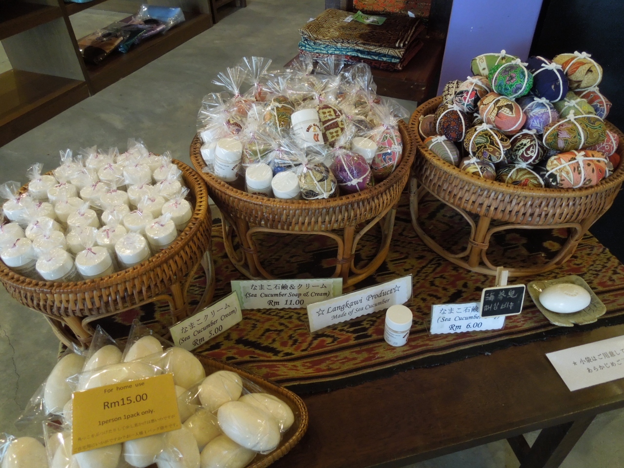なまこ石鹸6リンギ、なまこクリーム5リンギ。包がバティックでかわいく、おみやげにぴったり。
