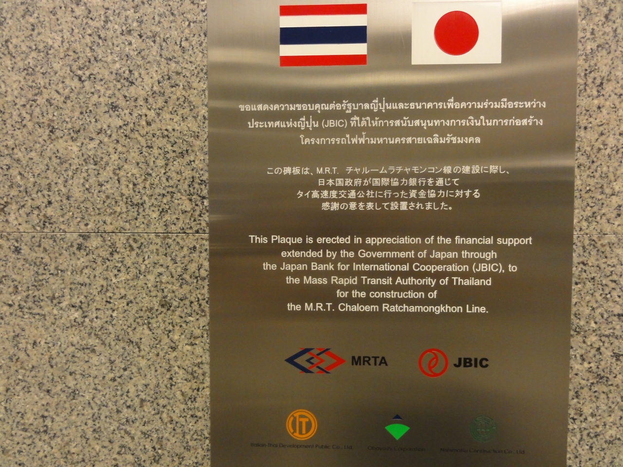 タイの市内は高架鉄道のBTSが有名ですが、地下鉄もあります。このタイランドカルチャラルセンター駅には広いコンコースがあります。コンコースには地下鉄の建設に対して、日本が資金協力をしたことに対する感謝の記念レリーフがありました。