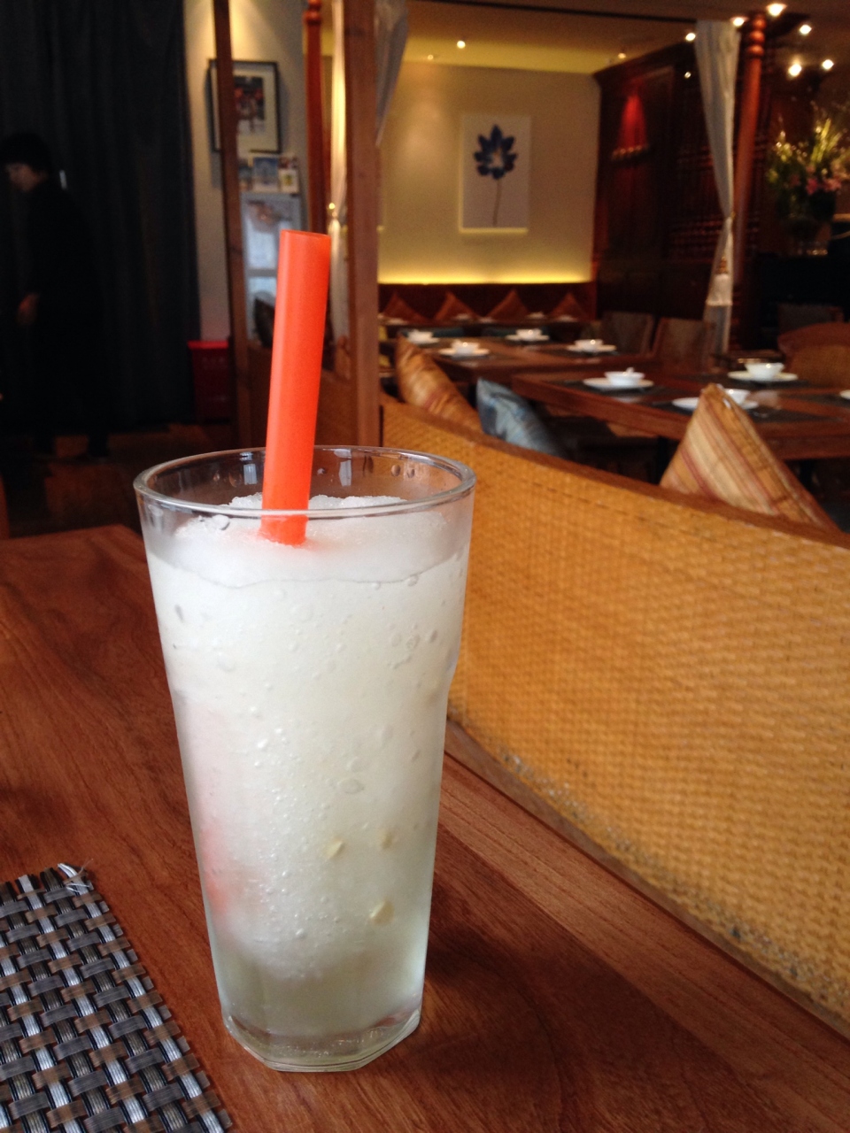 ランチタイムのセットは1つくらいあったかもしれませんが、アラカルトで注文しました。辛い物が苦手な友人が「辛くないカレーはどれ?」と聞くとイエローカレーが辛くなく、レッドカレーが若干辛い、グリーンカレーは一番辛いというのでレッドカレーを注文。あとは友人おすすめのエビのトースト、レモンのフローズンドリンク、ご飯を頼みました。