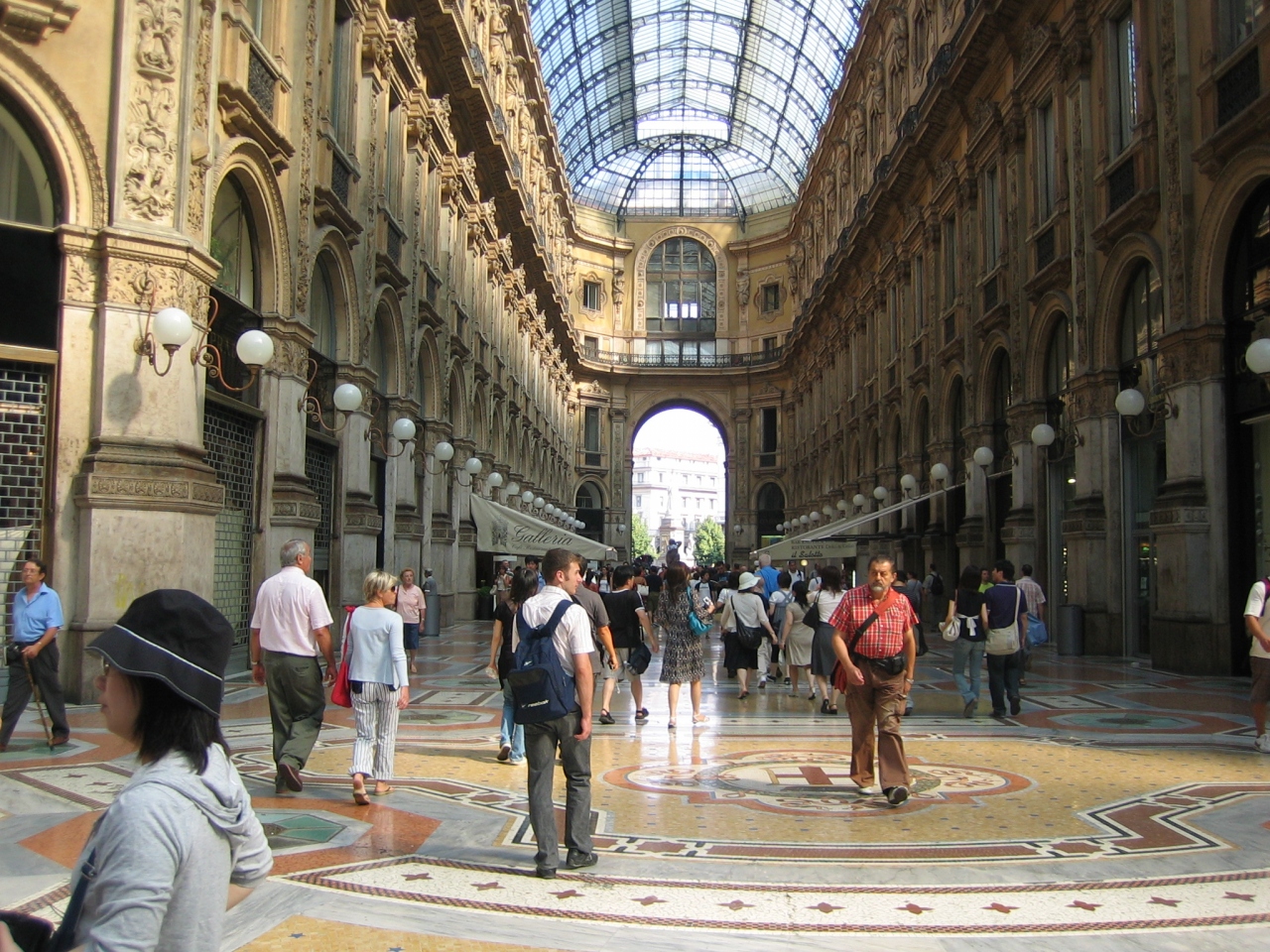 スカラ座からドゥオモへ向かう道に作られた巨大なアーケード。7つ星のホテルや黒と金を基調に揃えられた店舗が立ち並ぶ様は壮観の一言に尽きます。中央部分にくぼみがあって、そこにかかとをつけて片足でクルクルうまく回れれば幸運が訪れるという床なんかがあって、人だかりができてました。(そばにはプラダの本店も)