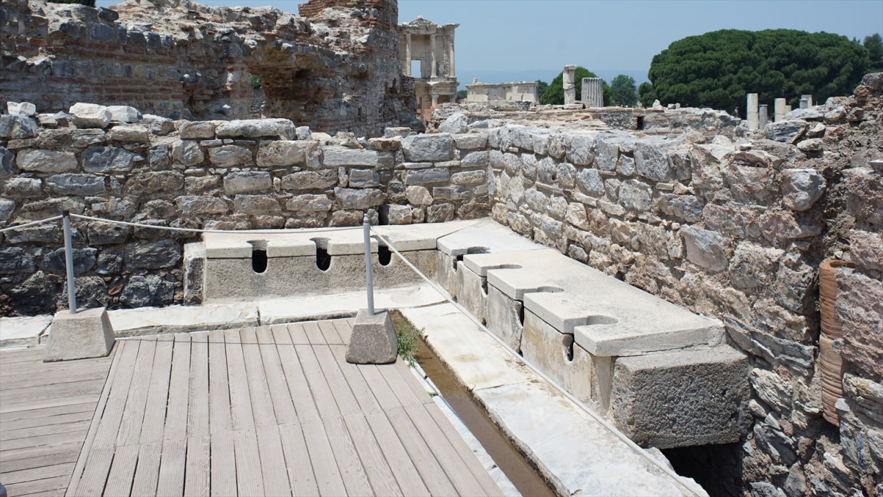 有名な公衆トイレの跡を見てきました。どうみても、ニセモノにしか見えませんでした。トイレそのものはもちろん、後ろの壁もごく最近のものに見えました。観光客用に作ったものでしょう。どうもエフェソスの遺跡はニセモノが多く、残念です。