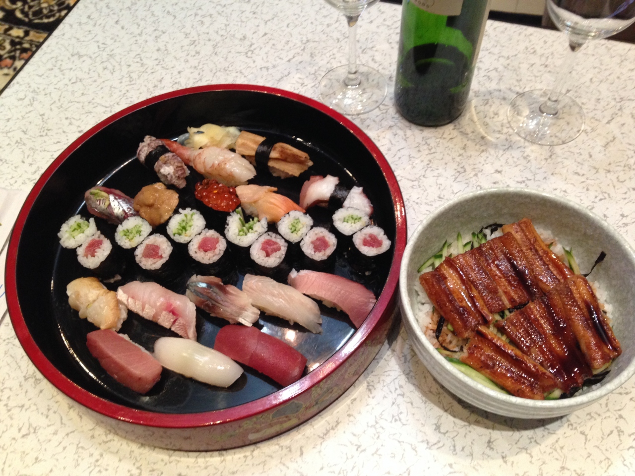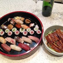あなご丼とアラカルトでお寿司を注文。あなご丼は酢飯ではなく白米です。ふっくらという感じはありませんが、なかなかおいしく頂けました。