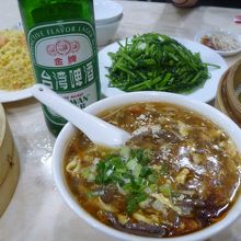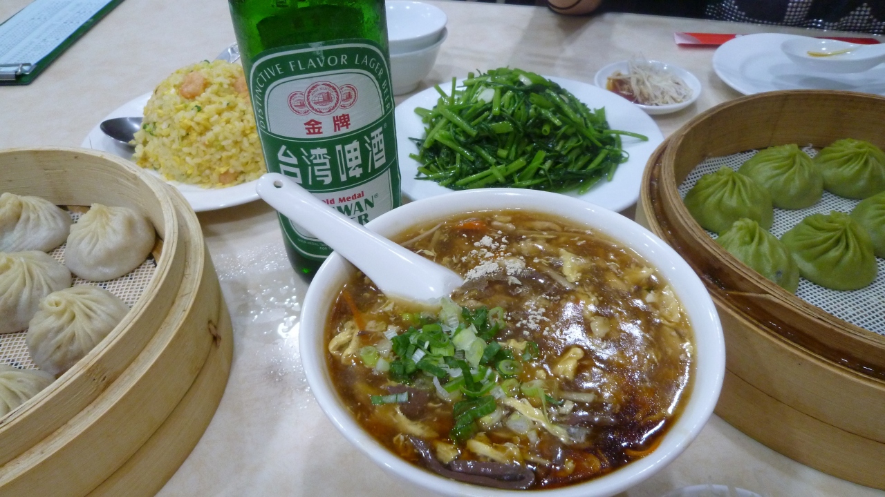 普通の小龍包と烏龍茶小龍包、空芯菜の炒め物に蝦チャーハンと酸辣湯、台湾ビールを頼んでクーポンも使って100元ほどでした。