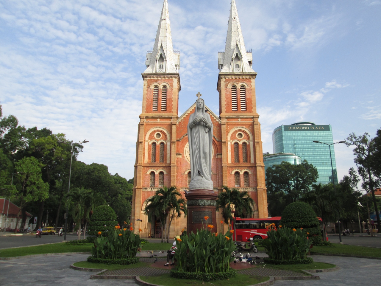 中央郵便局の横にあるサイゴン大教会です。教会の前にきれいな花壇があり、聖母マリア様の像が立っています。マルセイユから運ばれたレンガで建てられた、美しいゴシック建築です。フランス統治時代に建てられた教会は高い2つの塔があります。