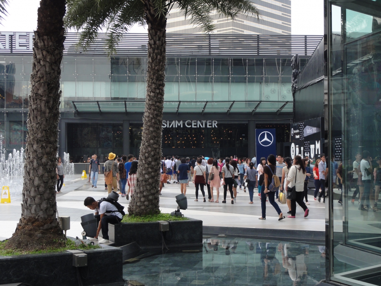 高架鉄道のBTSサイアム駅を降りたサイアムスクエアに行くと、サイアムセンターやサイアムパラゴンなどの綺麗で大きなビルが立ち並らび、普通のバンコックの街並みとは違った光景が広がっています。人でも多くにぎわっています。
