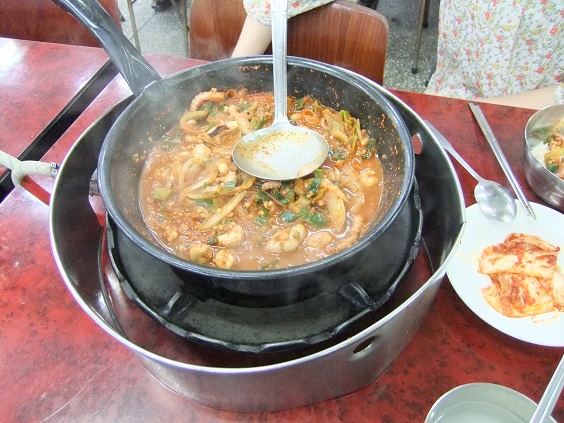 鍋の具はタコ、エビ、モツ(ホルモン)。その中の2種類や3種類全部のミックスもOK。タコ&エビを注文。ご飯が付きます。辛い鍋ですが美味しい。汗をかきながら頂きました。シメに麺類もありますが、食べ切れなさそうなので断念。日曜18:30。店内は結構な賑わいでした。