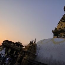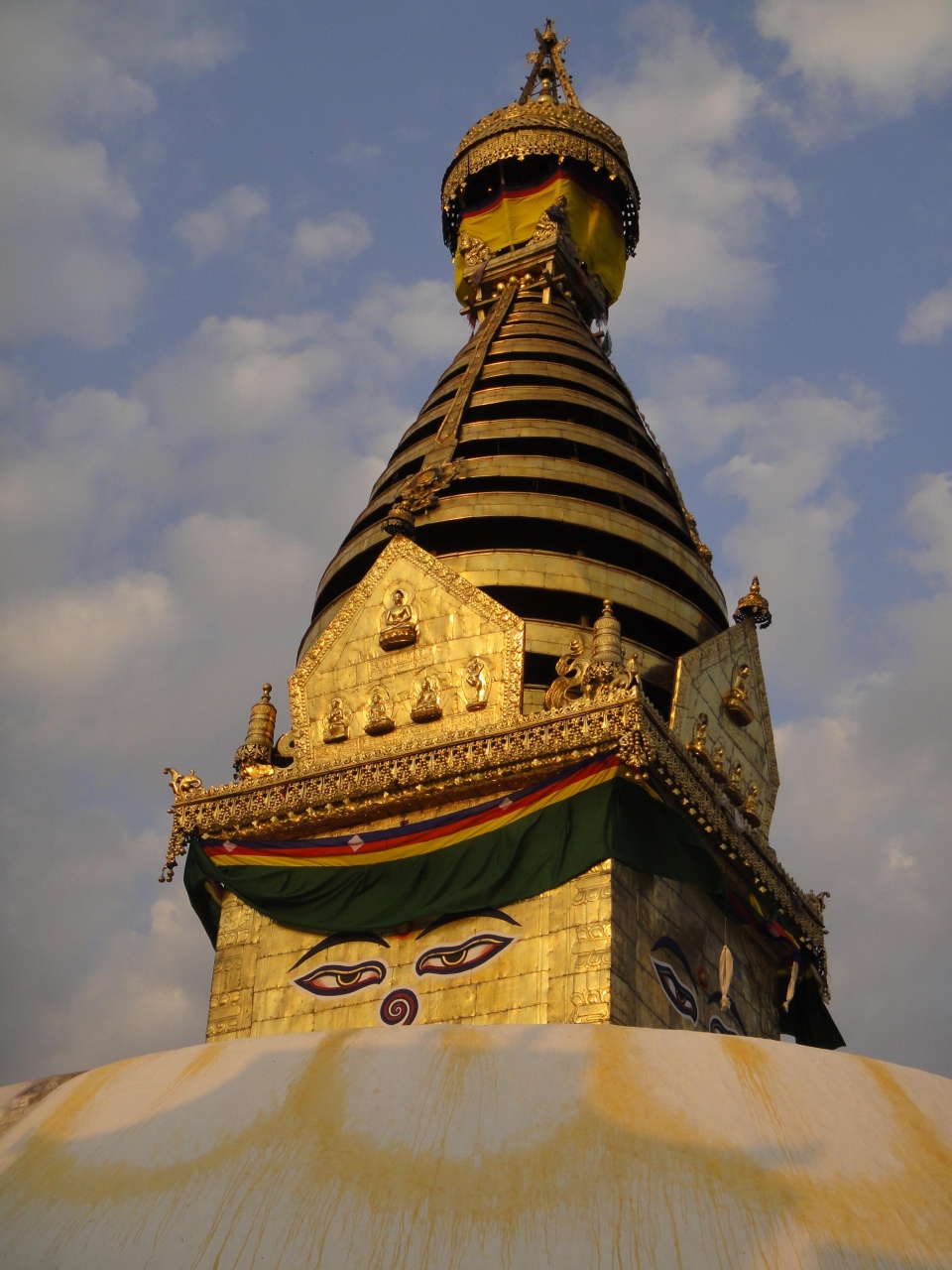 丘の上にありカトマンズの街が一望出来るので、地元の人はお参りしながら、街を眺めにきている人が多いようでした。皆、熱心にマニ車を回していました。真ん中のマハ・チャイテャも迫力ですが、黄金のハリティの建物がかっこよかったです。タルチョが青い空に映えてとてもキレイでした。