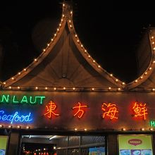 ジョージタウンからタクシーで15リンギットほどでガーニードライブに着きます。ここの屋台街もいいのですが、我々は海岸沿いに建つ東方海鮮舫(オリエンタル・シーフード)に行きました。海の上の橋を渡って店に入ると伊是酢や水槽が並び、ここで食べたいものを選べます。席は室内とテント張りの屋外がありますが、暑い時期でも夜になると屋外でも涼しく感じました。メニューには写真が載っているし、漢字表記もあるので注文は簡単です。中華料理の海鮮の店は間違いが無いので大好きです。