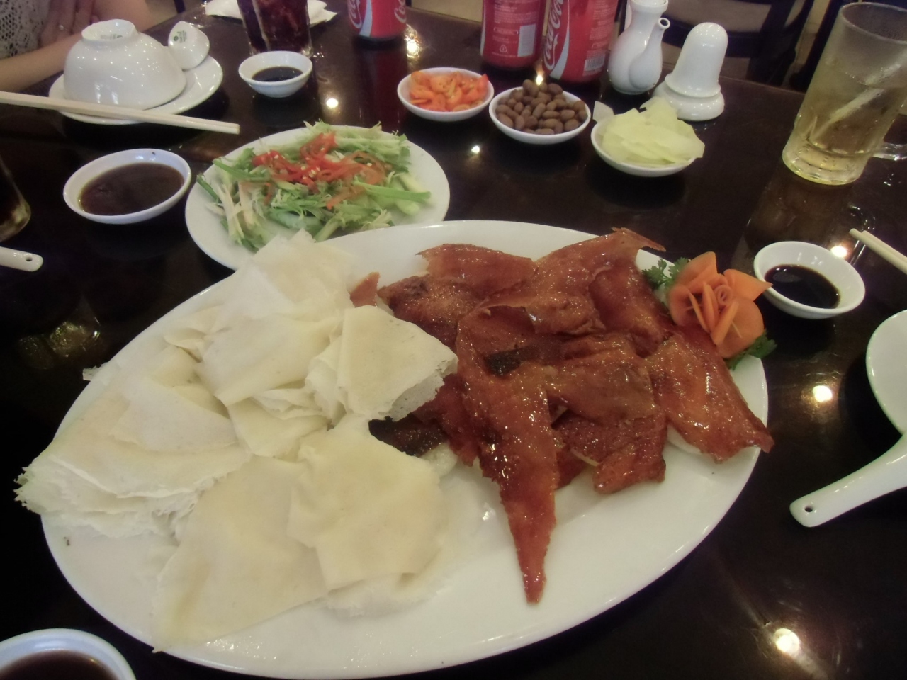 ホーチミン市5区のチョロン地区の手前にあるこの中華料理の店は、タクシーで行かなければならない少し不便なところにありますが、北京ダックの料理が安くておいしくてボリューム満点です。5人で行きましたが、全て食べきられないほどでした。北京ダックを注文すると、最初は皮の料理、次に骨付き肉のスープ、肉入り焼きそば、野菜炒め、竿後はフルーツとごま団子がでます。5人で1つの北京ダック料理で約4000円(飲み物は別料金)と安かったです。日本語は通じません。