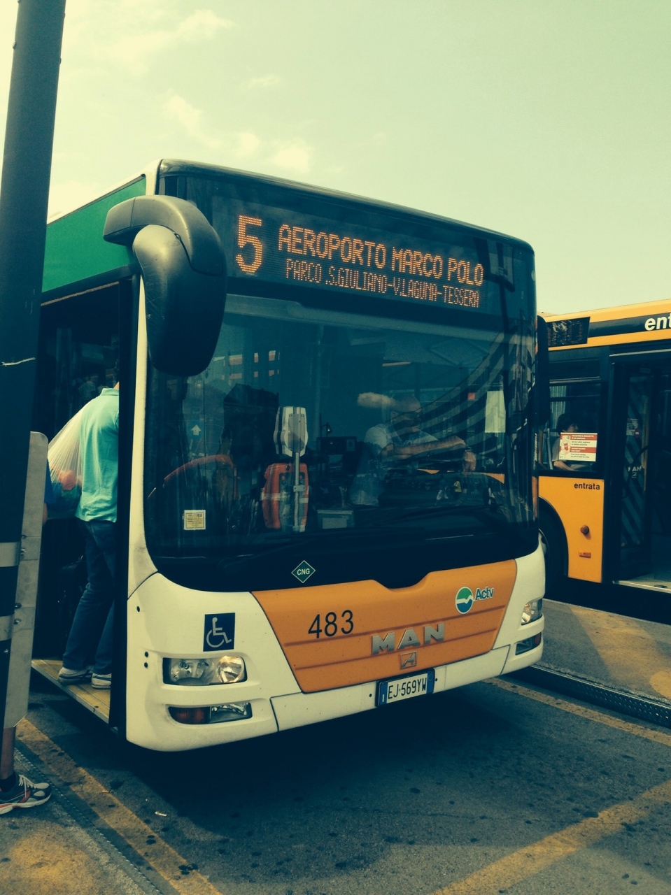 ATCV社のバスに乗りました。チケットは空港の荷物受取の自動販売機で買いました。片道6ユーロです。空港からベネチアのローマ広場までは、途中のバス停で乗客を乗せるので、20分くらいです。混みますが、ベネチア移動には便利だと思います。