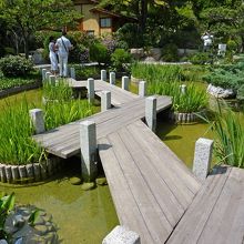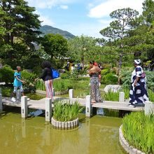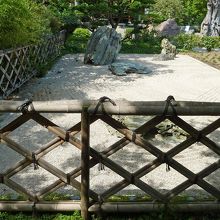 枯山水の庭園や菖蒲が植えられ錦鯉が泳ぐ池、石灯籠と