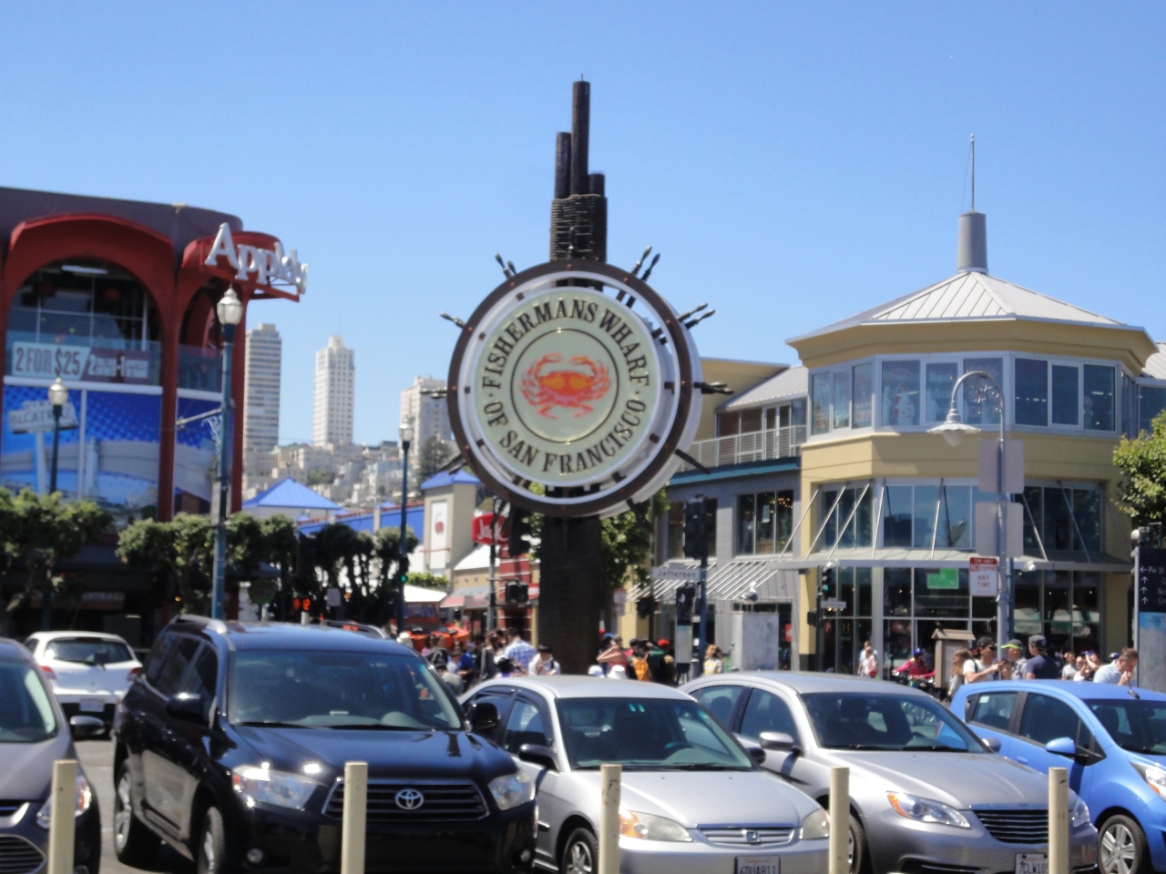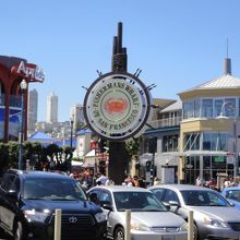 昔は漁港として栄えていたが、今はシーフード屋台、レストラン、お土産物屋さんが立ち並ぶ観光客人気のエリア。昔からある屋台エリア、カニチャウダーやカニサンドなど数々のシーフード料理が並んでいる。まずはジェファーソンストリートとテイラーストリートの角にある、フィッシャーマンズワーフのシンボル、カニのマークの看板前で写真をパチリ! 25年前と比べ、かなり臭くなくなったようだ。
