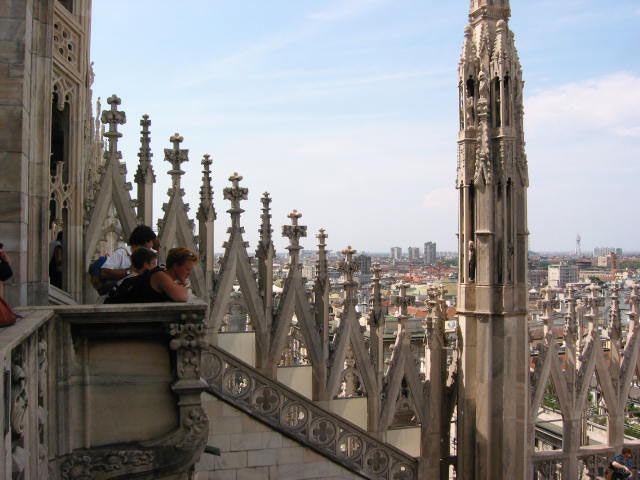 有料で建物の上までエスカレータで上がれます。常に列があり私は30分ほどで乗れました。並んでいる間に各言語のパンフレットを配ってくれます。日本語あり。夏場は照り返しで暑さがきついですが上る価値はあります。教会内は天井が高くステンドグラスも美しく見る価値あります。涼しいので椅子に腰かけて休むのもアリです。ただ大声で話したりだらしなく座らないようご注意ください。観光客が多いですが当然信者もいます。教会であること忘れずに。ミラノ自体、街が大きくないのでここを中心とした一帯が最大の観光スポットです。スリにはご注意ください。ミラノへ行ったら一度は必ず行くことをおすすめします