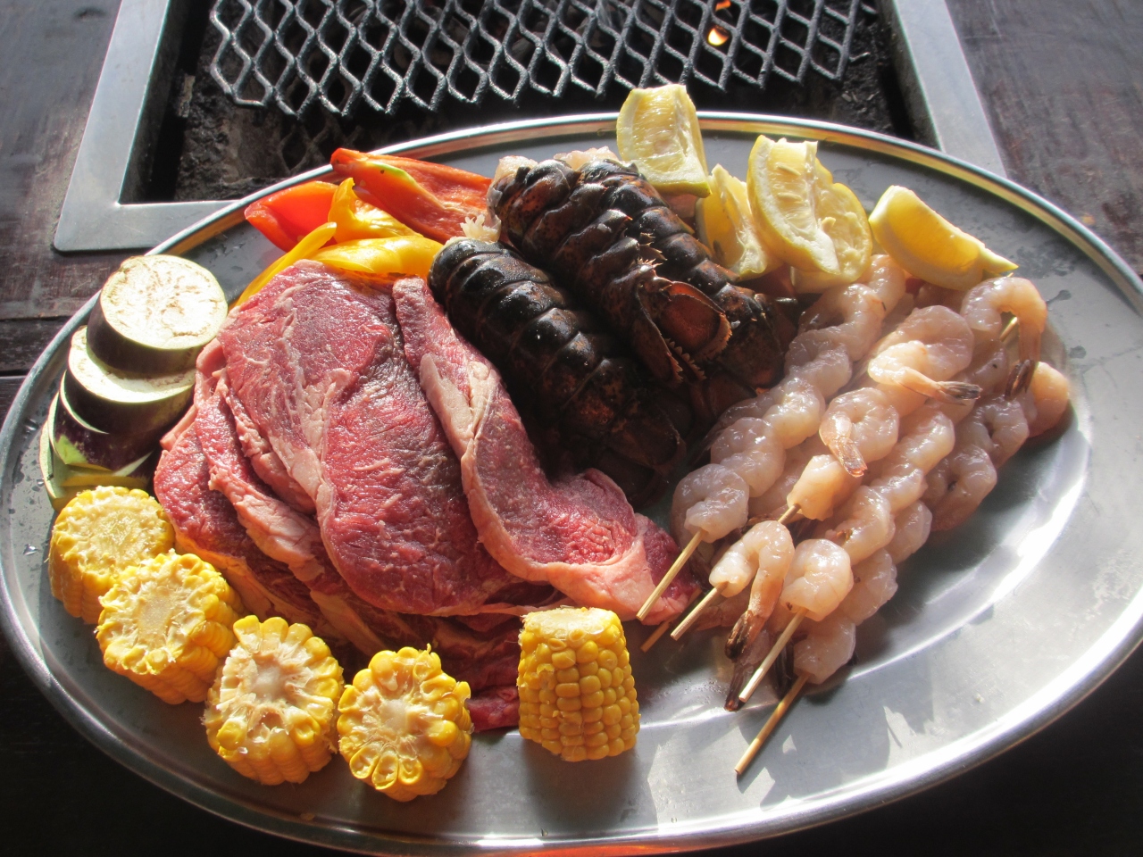 グアムらしい豪快なBBQが楽しめます。席からフィリピン海に沈む夕日が見えます。サンセットを見るなら1回目のコースがお薦めです。食材をセルフで焼くスタイルなので火の近くの席は汗だくになります。肉もかなりボリュームがあるので満腹になります。その他にもサラダ・ご飯・パン・味噌汁が食べ放題になってます。
