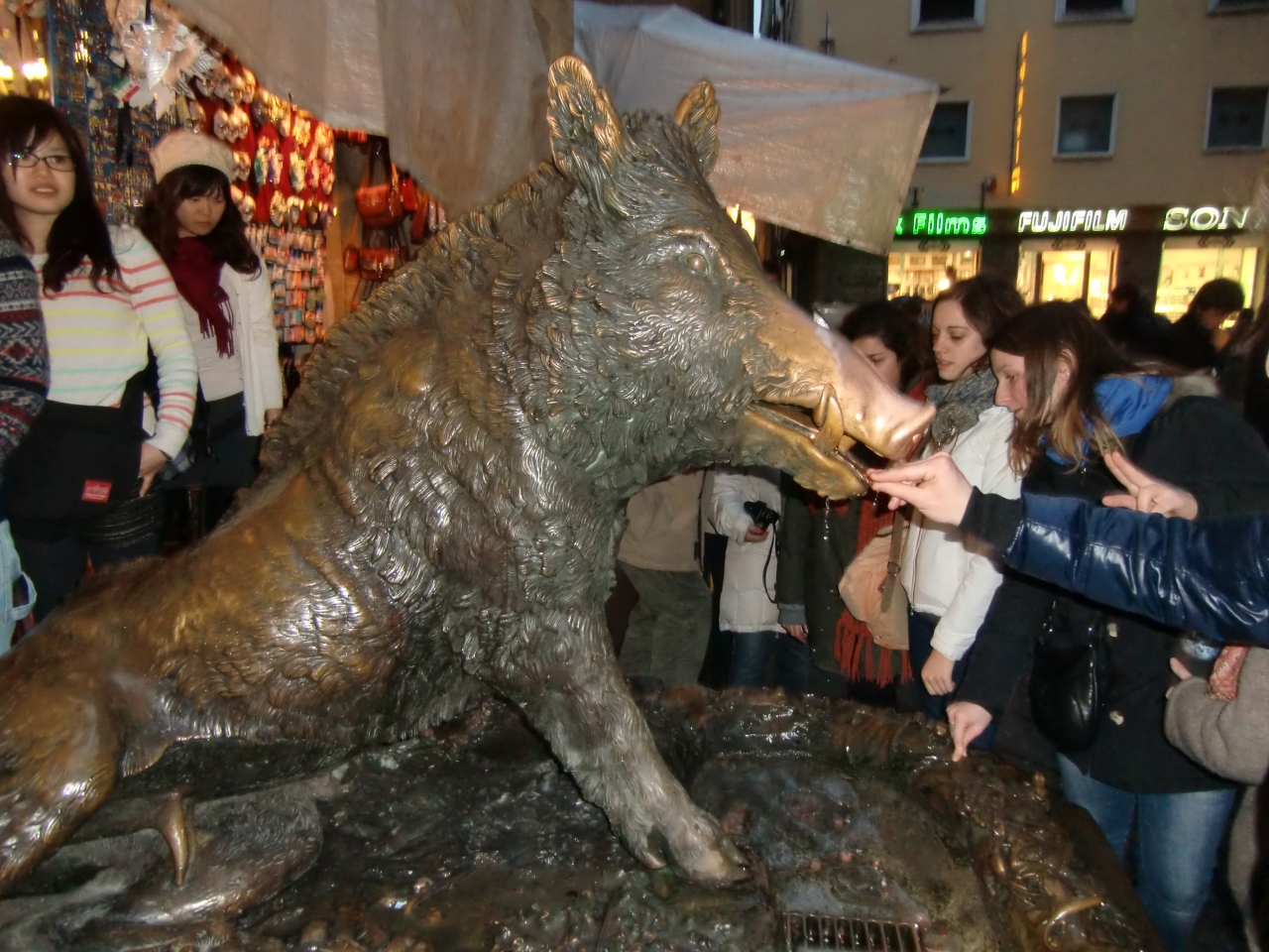 革製品を売っている露店の前にイノシシ像があります。イノシシの口の中からコインを落として、下の溝にうまく入ると、フィレンツェを再訪できるとのことで、みんな順番にコインを落としていました。しかし、ジプシーの女性が施しを求めにやってきて、溝に入り損なったコインを勝手に持って行ってしまったのには、どん引きしてしましました。