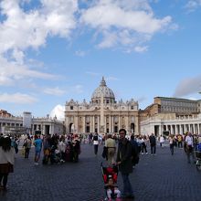 石像と石柱に取り囲まれた広場は圧巻です。サン ピエトロ広場の中心に立ち、360度どこを見渡しても素晴らしい景観で、息を呑みます。日曜日の昼間に訪れたところ、大聖堂への入場を待つ人々が長蛇の列を作っていました。