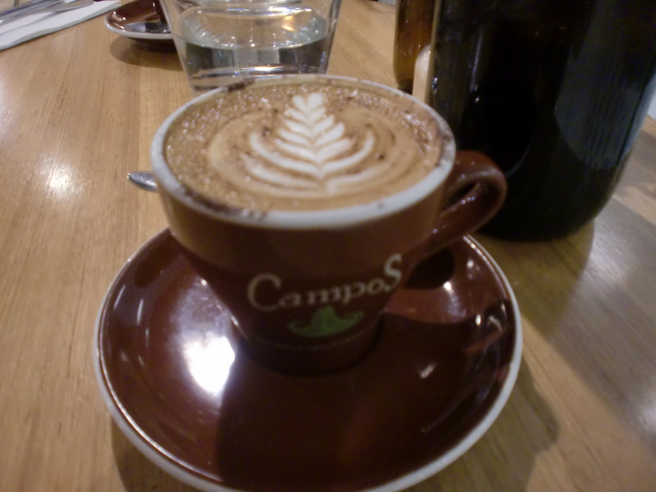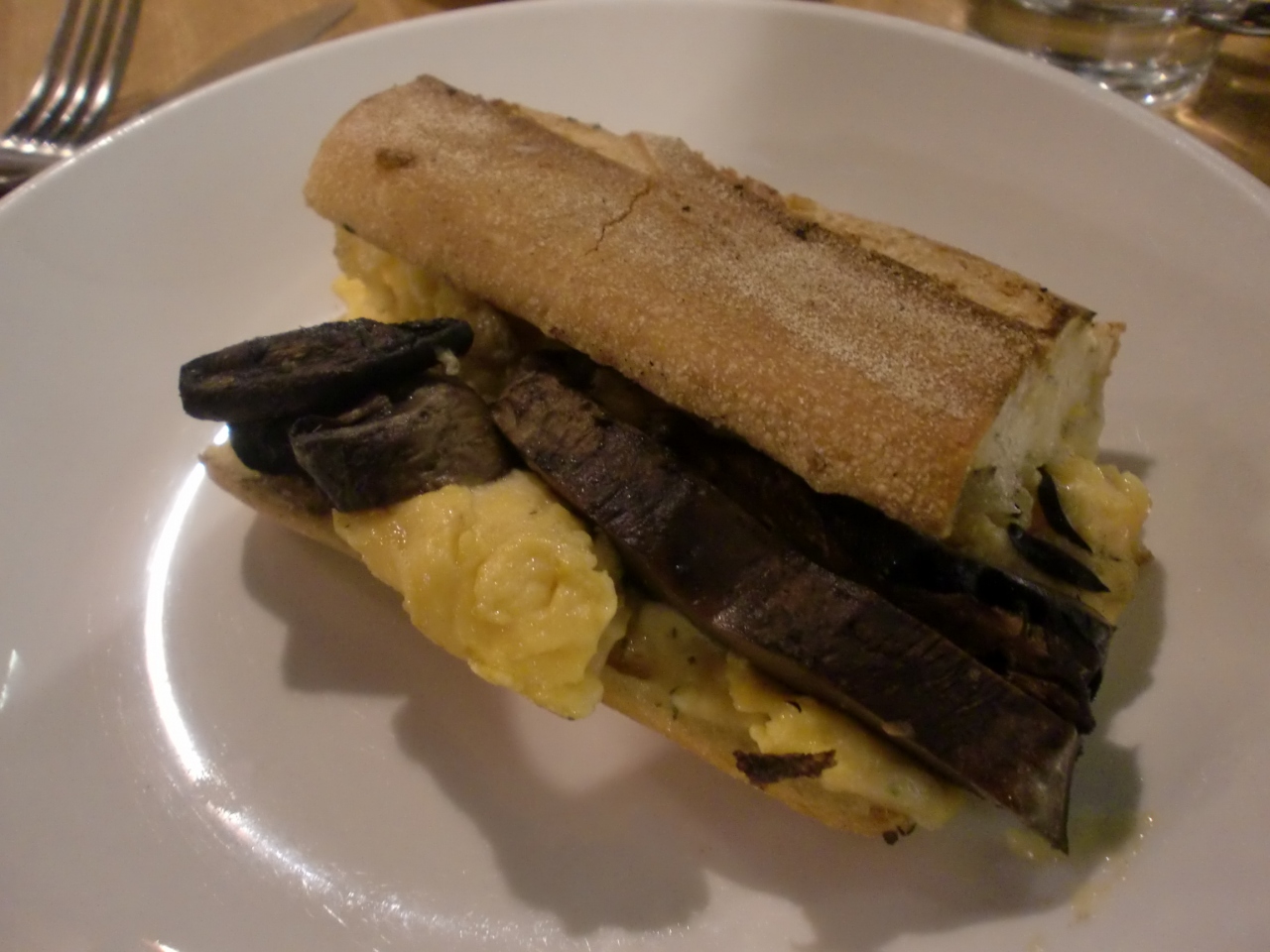 英語メニューを見てもよくわからなかったので、入口のケースを見に行ってサンドイッチを選びました。見た目はイマイチですが、とっても美味しい。黒いのはマッシュルームのソテーで、黄色は卵です。パンもおいしくて、とてもいいランチになりました。