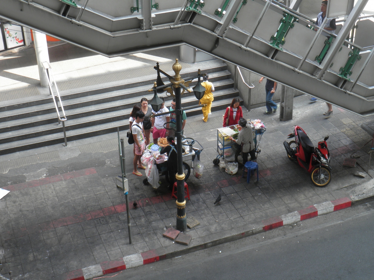 バンコクのシーロム通りを歩いていたとき、お腹がすいたので歩道橋下のおかず屋台で揚げ物を買いました。 ついでに、フルーツ屋台でスイカも手にいれました。 屋台で買うときには、なるべくお客さんが多い人気のある店で買うようにしてます。