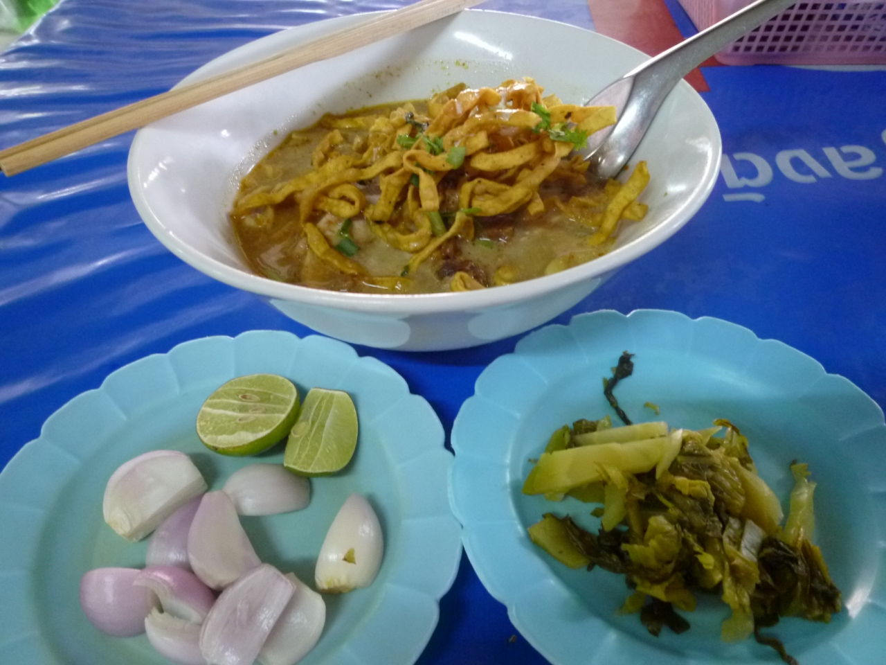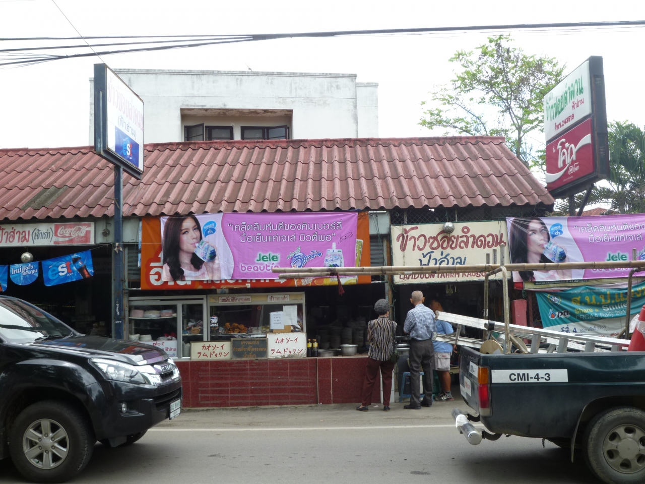 お店は街中心部から少し距離があるのでレンタサイクル・レンタバイク・TUKTUK等で行くのが望ましい。ただ歩けない距離ではない…自分の場合は行きTUKTUK利用、帰りは腹ごなしにノンビリ歩いて戻る。ワロロット市場までノンビリ歩いて約30分位。カオソーイはガイ(鶏)・ムー(豚)・ヌア(牛)が選べる。オススメはムーだが量は多くないので男性なら2杯、ムーとガイを注文すると良いかも。スープはカレー味だが辛さはない。麺だけでは足りないという人はカーオモックガイ(イスラム式鶏炊き込みご飯)を注文すると良いかと思う。黄色の炊き込みご飯はパラパラに仕上がりフライドオニオンを混ぜて食べると美味しい、付け合わせの鶏肉も骨離れがとても良く柔らかい。兎も角チェンマイに来たら是非必食のお店です。