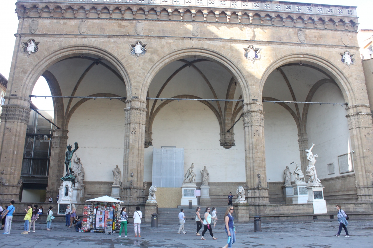 ヴェッキオ宮殿前の広場です。周りにはカフェなどがありました。ヴェッキオ宮殿の入り口には、ミケランジェロのダビデ像のレプリカがあります。入口の右横には、様々な石像が展示されていました。展示されている石像は撮影禁止のようでした。
