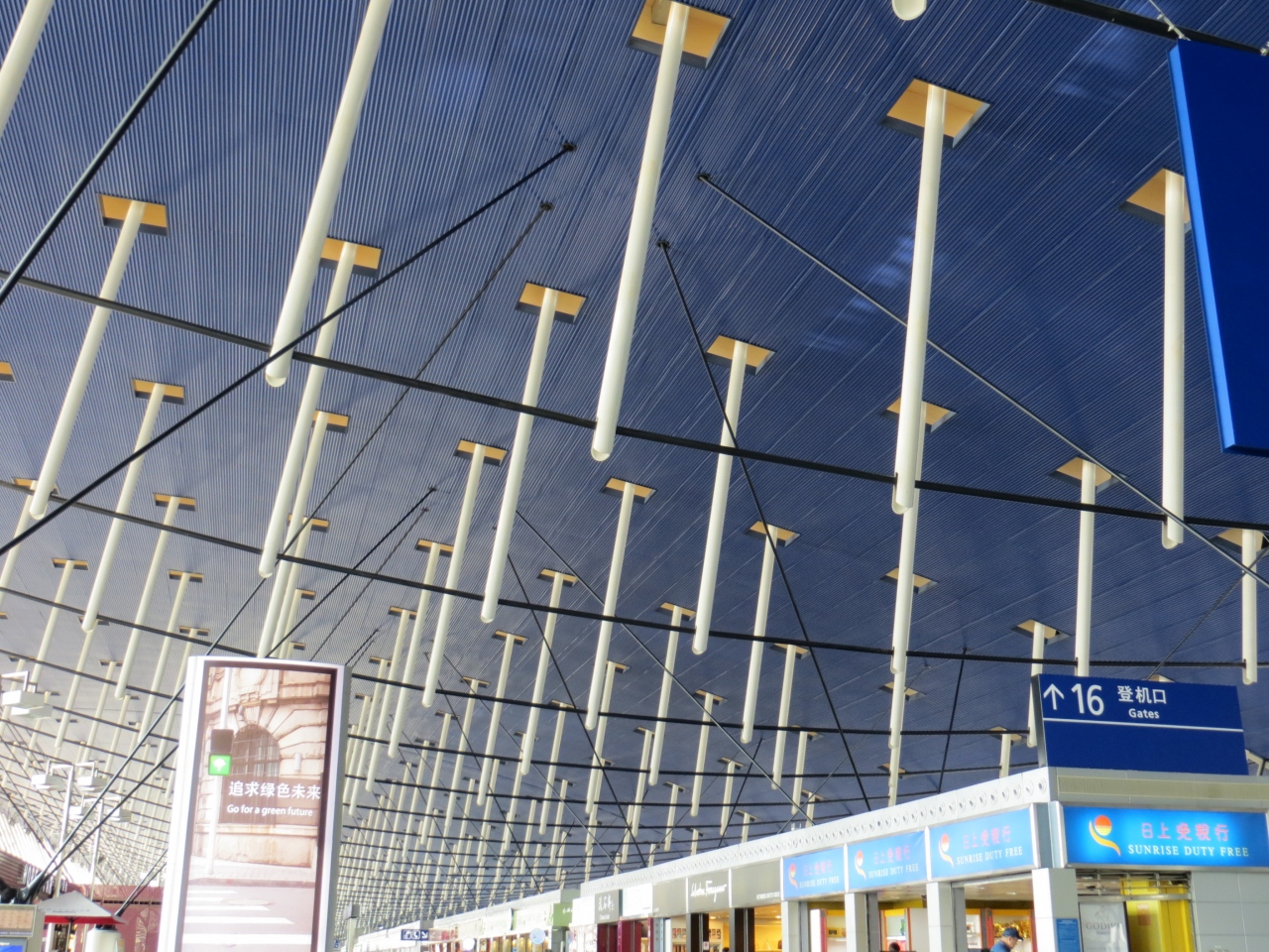 成田から浦東経由で香港へ行く時利用した。チェックイン後のエリアに、携帯用の充電エリアがあり、乗換のお客にとって便利だ。カフェ、コーヒーショップもそろっているので、お腹が空いてもそこに済ませる。おみやげ店もあるが、商品はあまり魅力的ではないと思う。氷とお湯を無料で提供している。