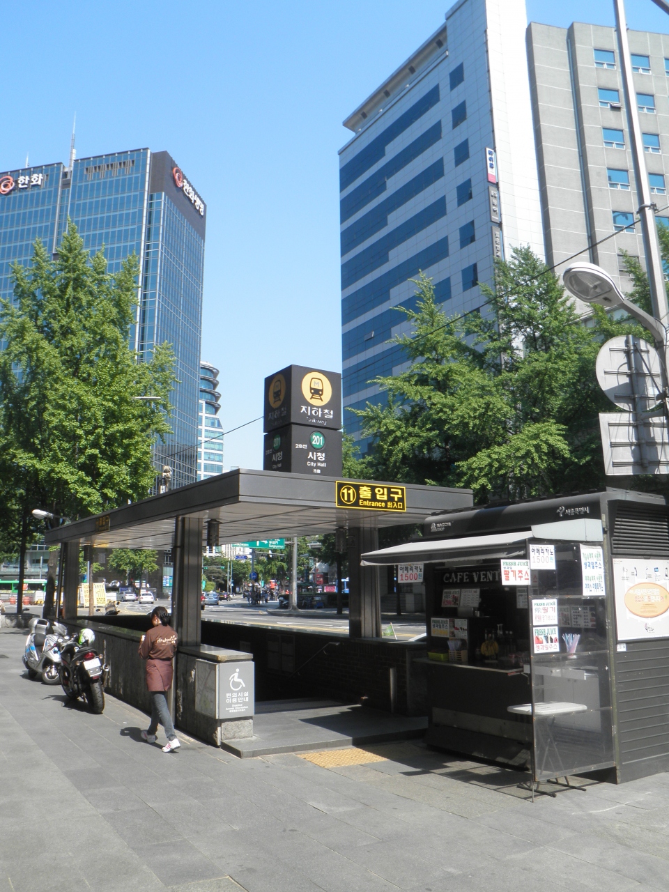 徳寿宮とトルダムキル(石垣道)を観光するとき、ソウル地下鉄の市庁駅を利用しました。 休日だったせいか、構内は閑散としていました。駅番号は201で、出入り口のところにカフェスタンドがありました。 ちゃんとCity Hallと英語表記でわかりやすかったです。