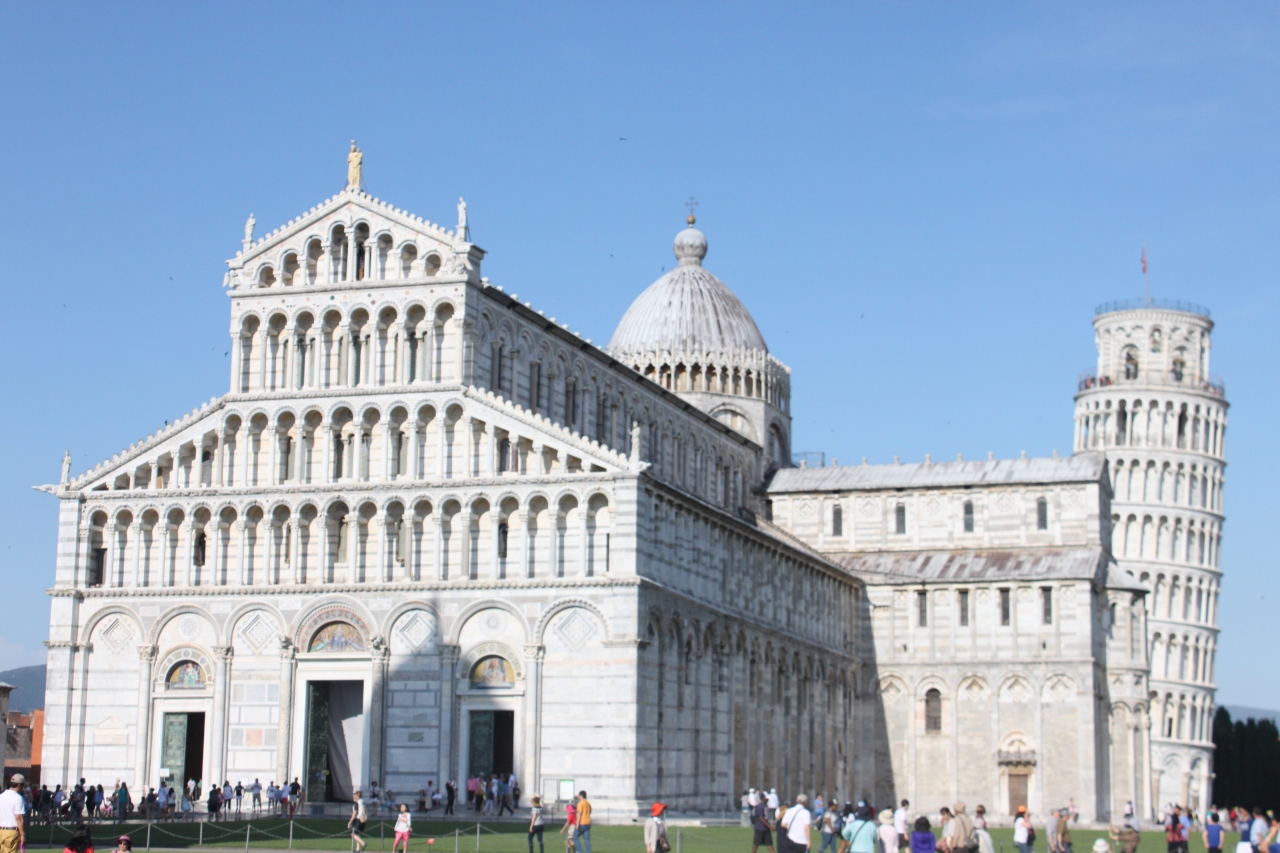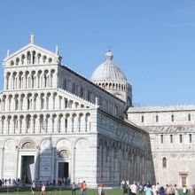 ピサ中央駅からバスに乗って、午後6時頃に到着しました。広場に行くと、観光客であふれかえっていて、たくさんの人が斜塔を支える記念写真を撮っていました。広場の緑の芝生がよく手入れされていて、建物とのコンストラストがとてもよかったです。