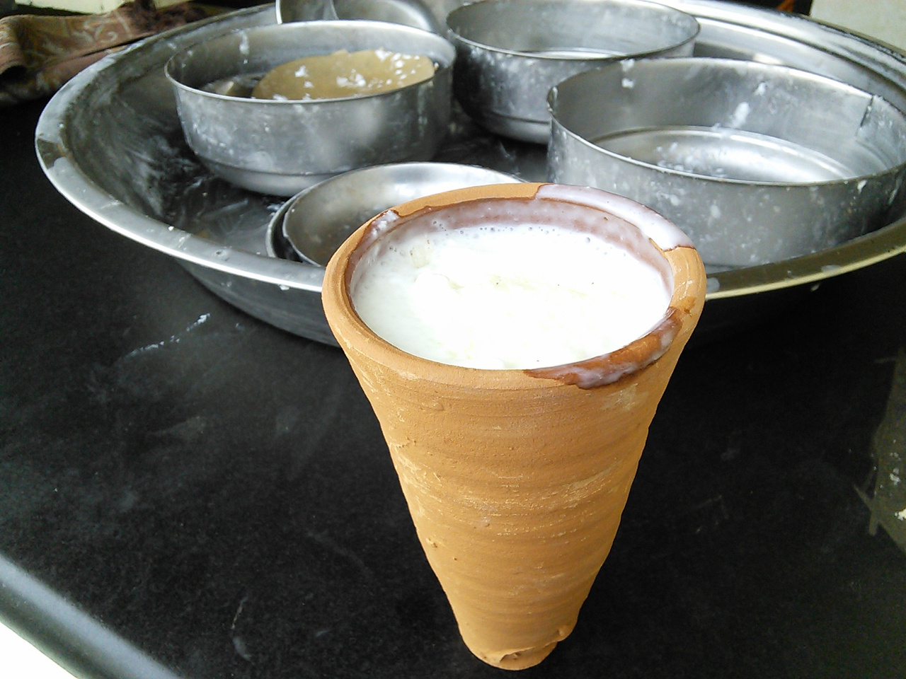 行ってみたらびっくり!なんと4軒も「LASSIWALA 」の看板を掲げた店があるではありませんか。どれが元祖かと思いましたが向かって左端の一軒だけに人だかりが…。そのインド人観光客に聞いたらここが元祖だと言う。アテにはなりませんが。そしたら悲劇が…、なんと私が買おうとしたらちょうど売り切れ~。やはり人気店ということはここが元祖でしょうか。(確証はありません)仕方がないので隣で飲みました。値段はどの店も同じ。大40Rs、小20Rsです。味はおいしかったけどまあ普通でした。