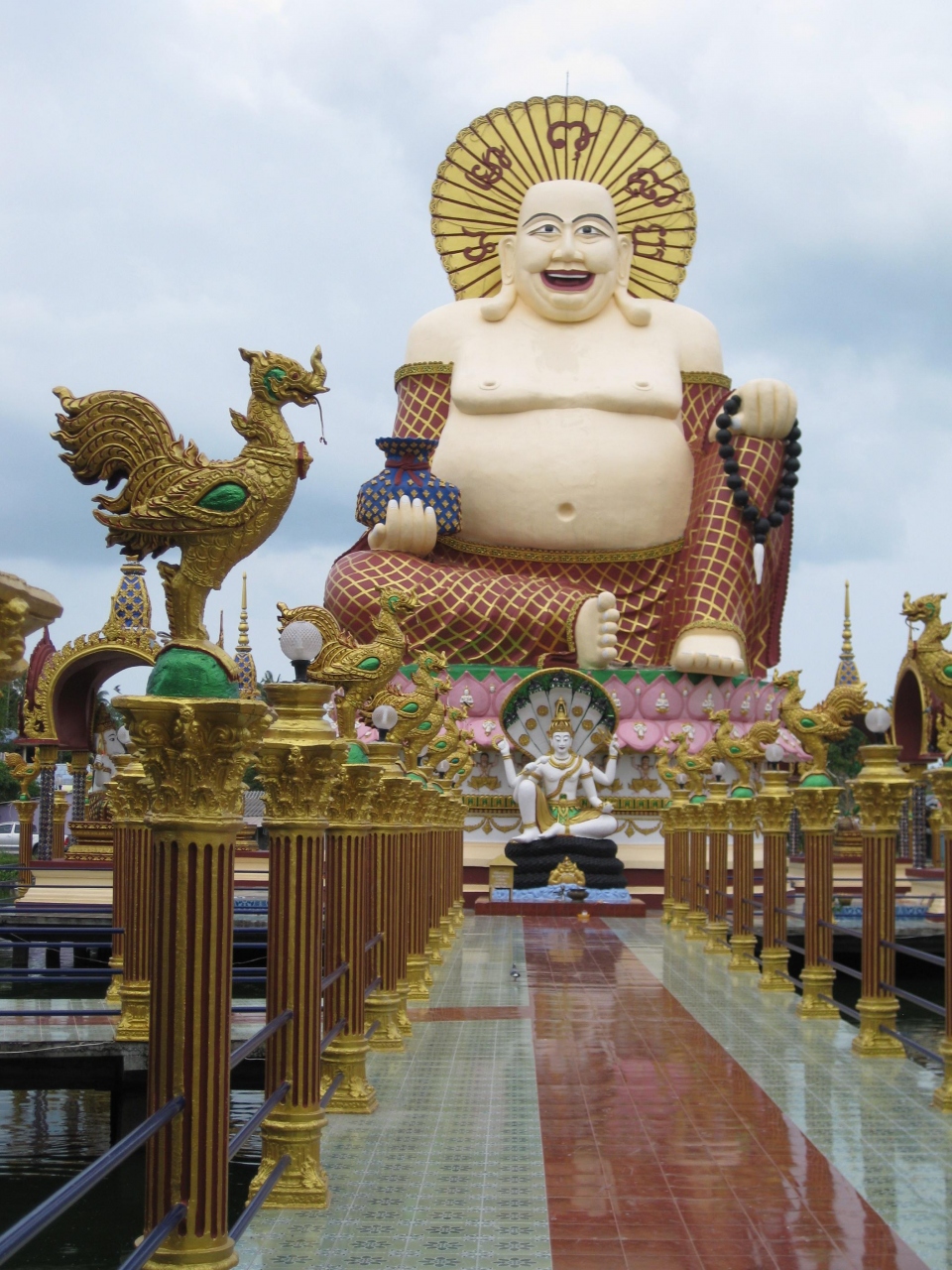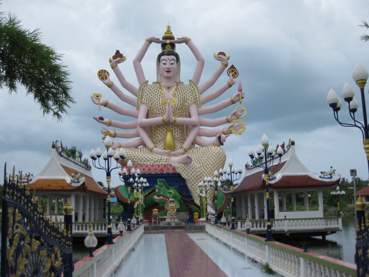 建物はまさにタイによくあるきらびやかなお寺です。そのお寺とは対照的に湖にあるのが千手観音とえびす様です。どちらも大きく、はでに彩色されていますが、風景とマッチしていて、きれいですよ。湖に浮かび上がっているようです。千手観音とえびす様のどちらの周りにも色々と仏像や像が細工されていて、見て回るだけでも楽しいです。日本人の感覚からは違和感がありますが、それらを物色してみると楽しいですよ。日本では絶対に見れない風景です。