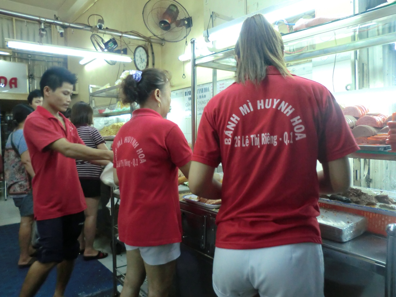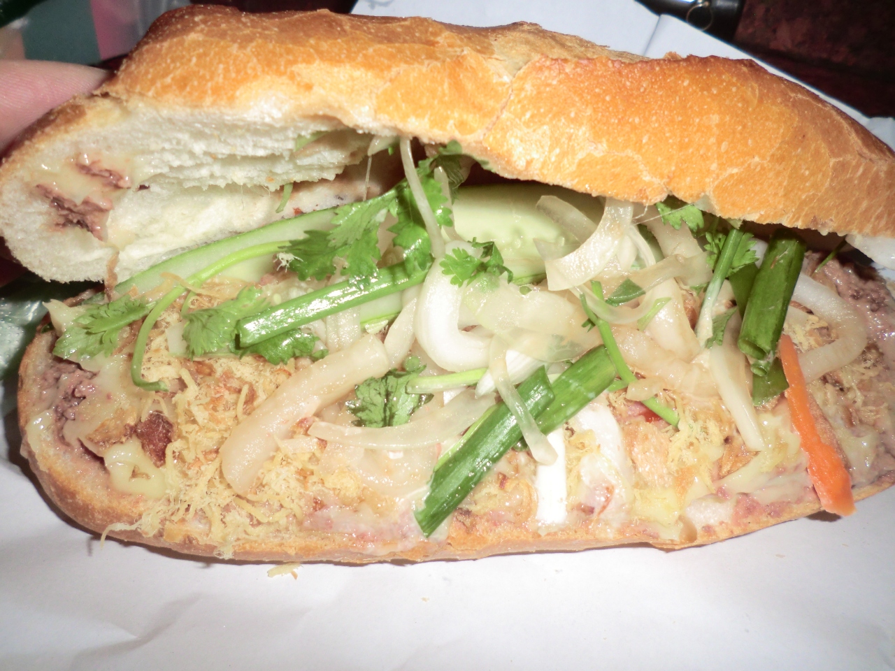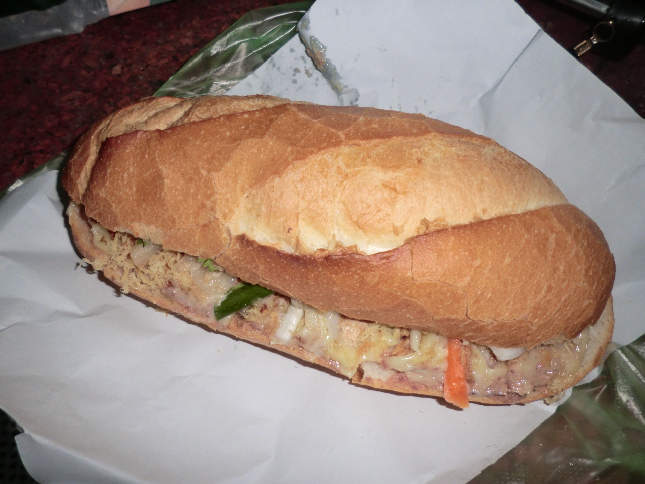 バインミーは30000ドンで、パンはふわふわぱりぱりで中は具がいっぱい。見た目以上にボリュームがありました。