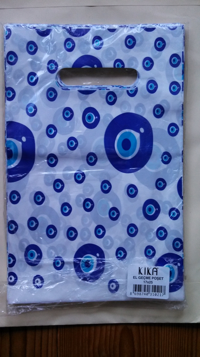 エジプシャンバザールから北西方向に延びるHasircilar Cd.沿いの問屋街で,ちょっとしたお土産を配るのに最適と,魔除けの青い目玉"ナザール・ボンジュウ"がデザインされた袋を購入。