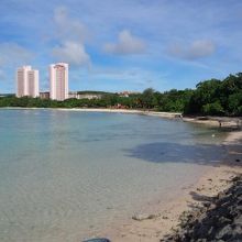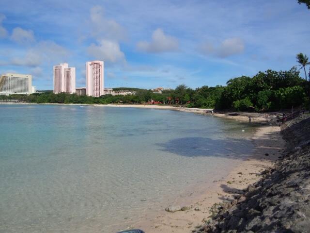 タモン湾沿いには多くの有名ホテルが立ち並んでいてます。海辺には白い砂浜があり、沖ではサンゴ礁の縁辺で浪が砕け白波が立っていました。沖の礁の縁辺までは、遠浅で、干潮時には、かなりの沖合までは歩いていけました。ただ、海底にはサンゴのかけら等があり危険なので、裸足では歩かない方が良いでしょう。
