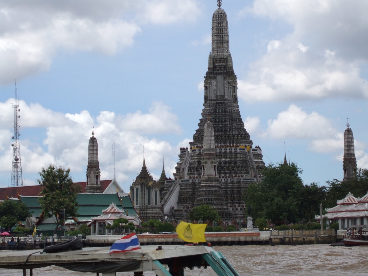 チャオプラヤ川を越えた場所からの眺めがいい、定番スポットです。市の中心部からは渡し舟に乗って訪問することになりますが、趣きがあります。近くに行くと古い石積みの寺院ですが華麗なエメラルド寺院とは違った良さがあります。