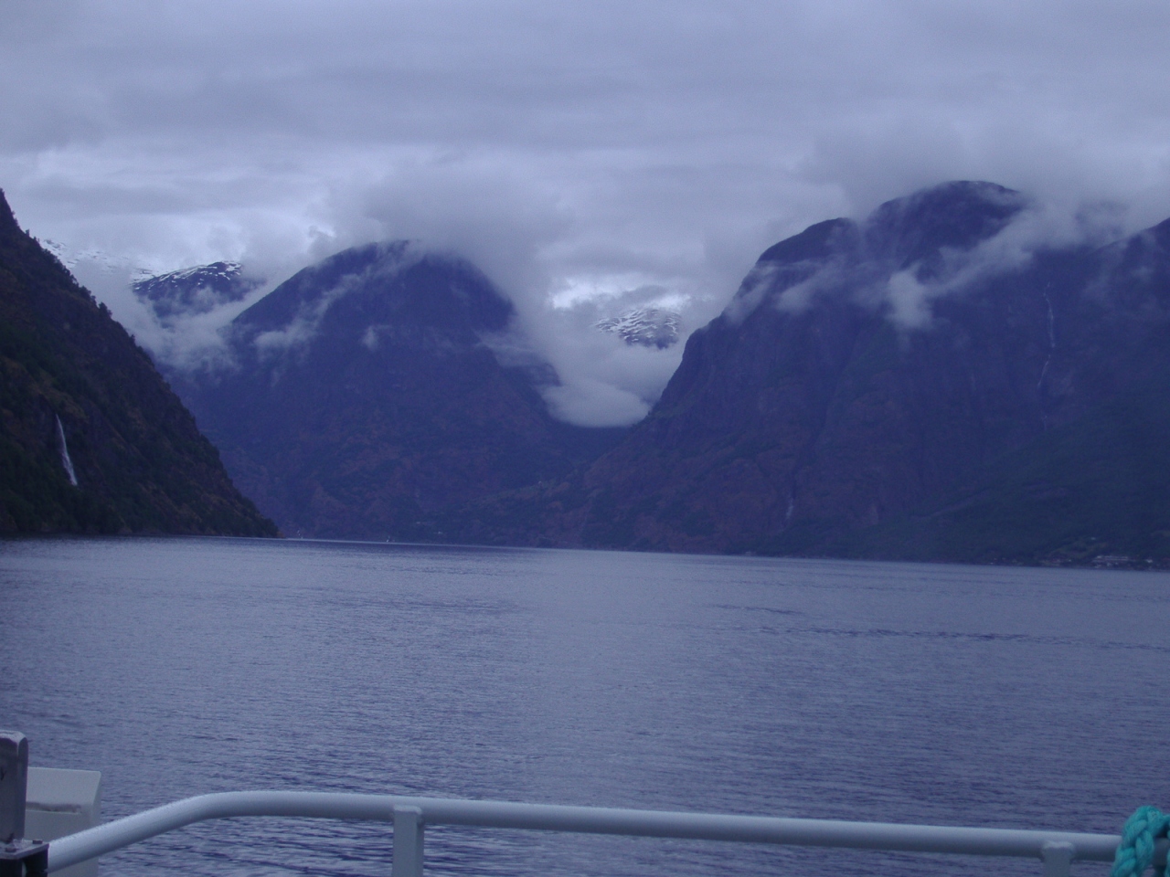 フロムからベルゲンまでクルーズ船に乗りました。船は、左右から迫る山肌の間を、 すり抜けるように巡航します。世界遺産・ネーロイフィヨルドとの分岐のあたりはうっすらと霧が立ち込め、実に幻想的な光景でした。 滝に近寄り、グラスで水を汲んでくれて、飲むこともできました。