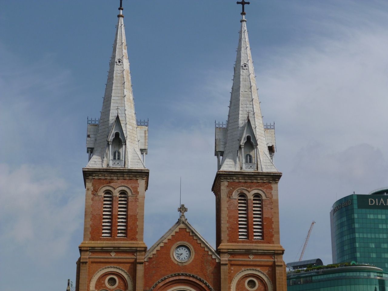 郵便局のとなりにあって、ホーチミンの市内観光でよくでるスポットです。中に入ると左右にステンドグラスがはまっていて、中心は天井がたかいです。ミサの時間に訪れたので、手間のところのみで見学しました。かなり高さがあるので、すこしはなれて外観とるときれいです。