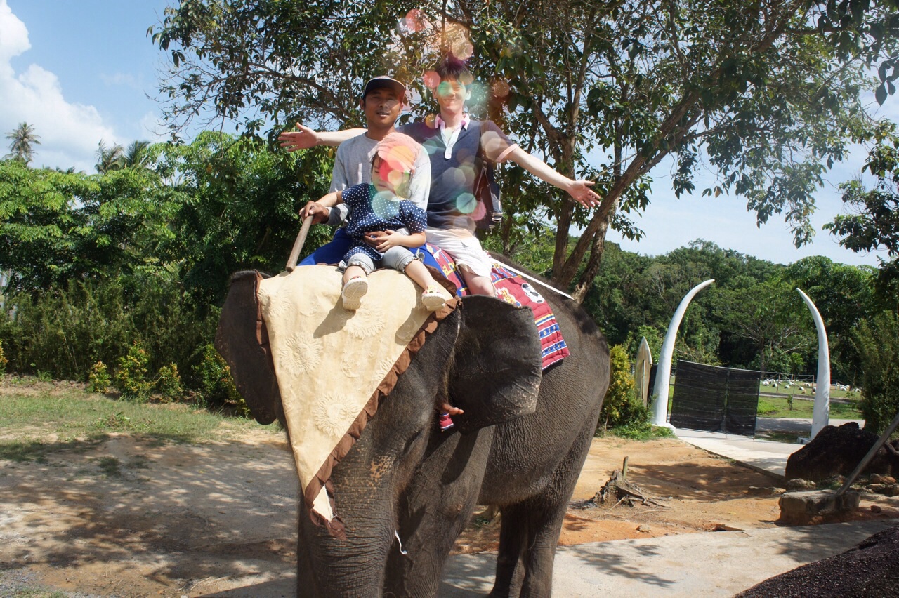 幼児はゾウの頭に乗りました。
