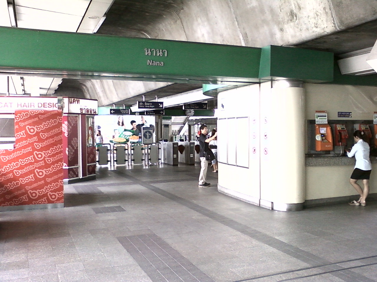 このナナ駅 (BTS) は、バンコクで有名な夜の繁華街ナナプラザの最寄り駅です。駅周辺にはホテルやレストランなども多くあり、また夜には屋台も多く出ています。このあたりの夜~早朝までにかけてのの一人歩きは、スリなどが多く注意が必要です。