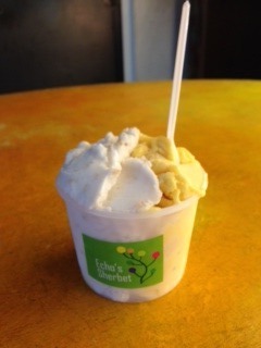 私はジェラードを注文しました。カップは大・中・小の3サイズ。中カップから複数盛りを注文でき、今回はライチとミックスフルーツにしました。120元。ちなみに小は70元。大は200いくら。←忘れちゃいました。