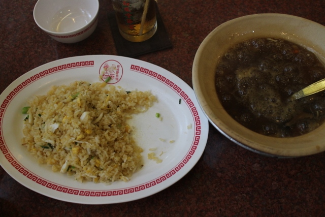 お店のなかは、広くきれいです。暑いのでまずは冷たいお茶を頼んで、フカヒレとカニチャーハンを食べました。