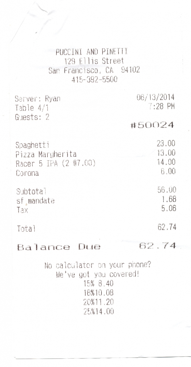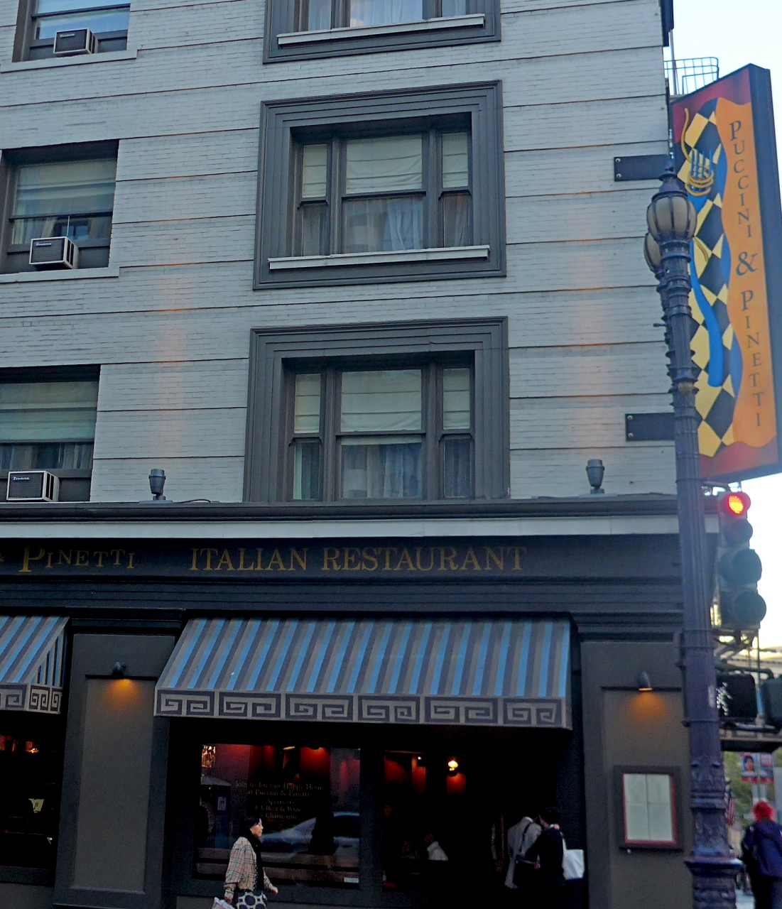 Puccini& Pinettiが正式名,ユニオンスクエアに近くて便利.カジュアルで入りやすい.ピザ13ドルとスパゲティボロネーズ23ドルを食べた.アメリカンサイズではないがスパゲティのミートは多い.まあ並みの味だが,米国の大味の中では日本並みなのでいいとおもう.スパゲティがうどんのように柔らかくないだけでもうれしかった.